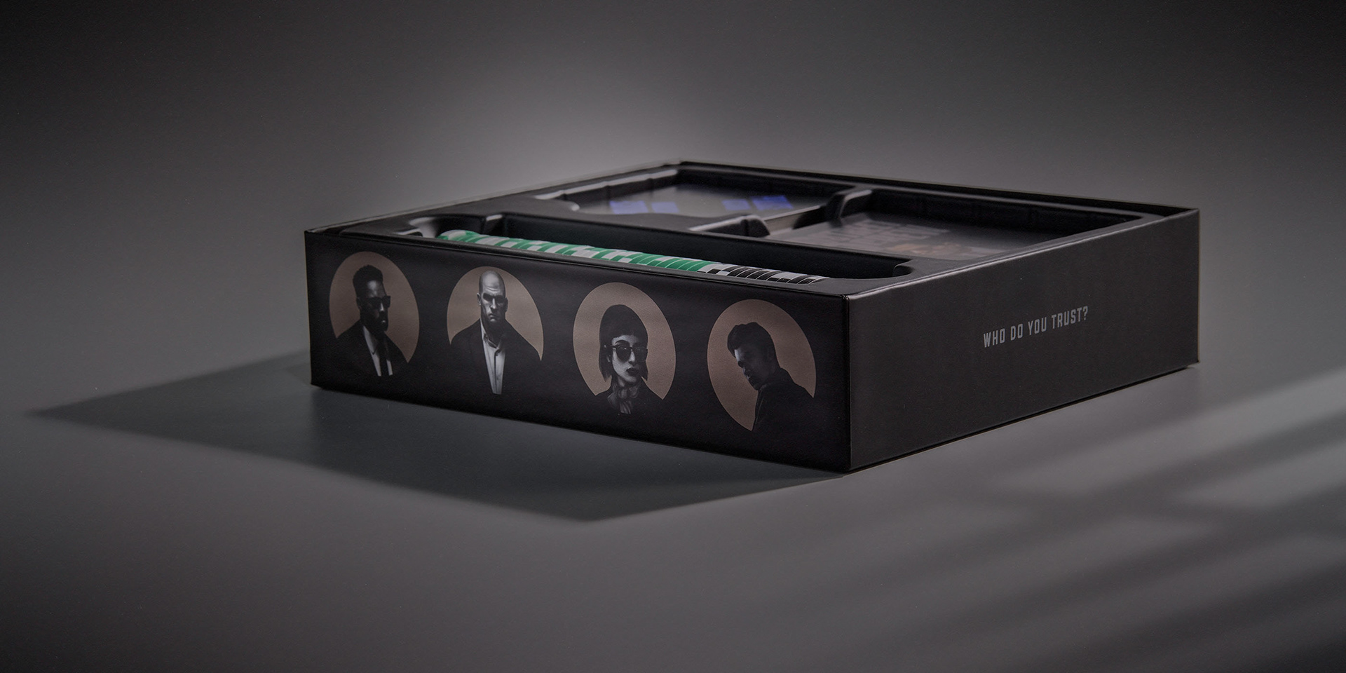 The package design and crew member illustrations capture the tension between loyalty and betrayal, where shadows hold secrets and every face tells a story.
