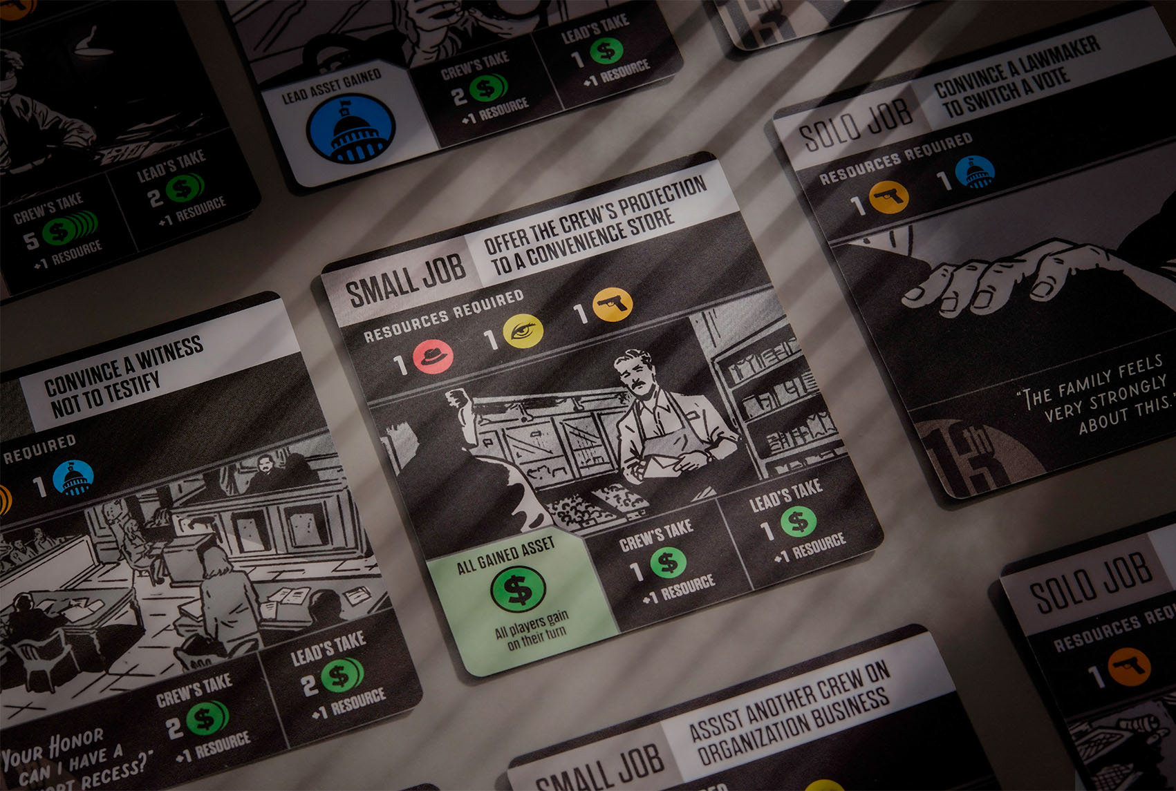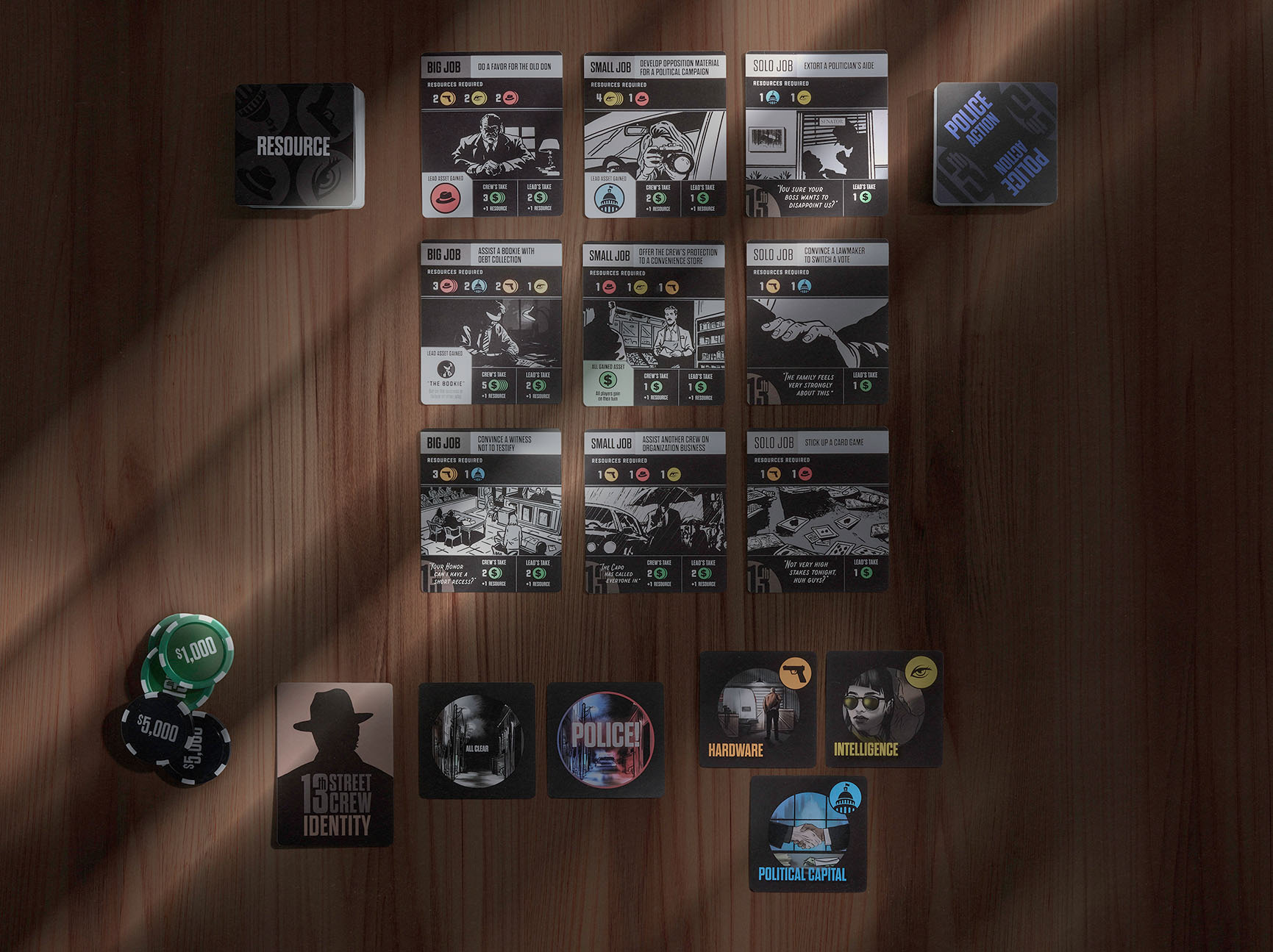 This 3-7 player social deduction game casts players as either loyal crew members or a potential police informant, though no one knows for sure if there's a rat in their midst. Players must collaborate on various criminal jobs while managing resources and trust, with success bringing rewards but police intervention resulting in failure. Victory comes through either earning enough money as loyal members or, for the informant, helping the police bust enough jobs to bring down the crew.