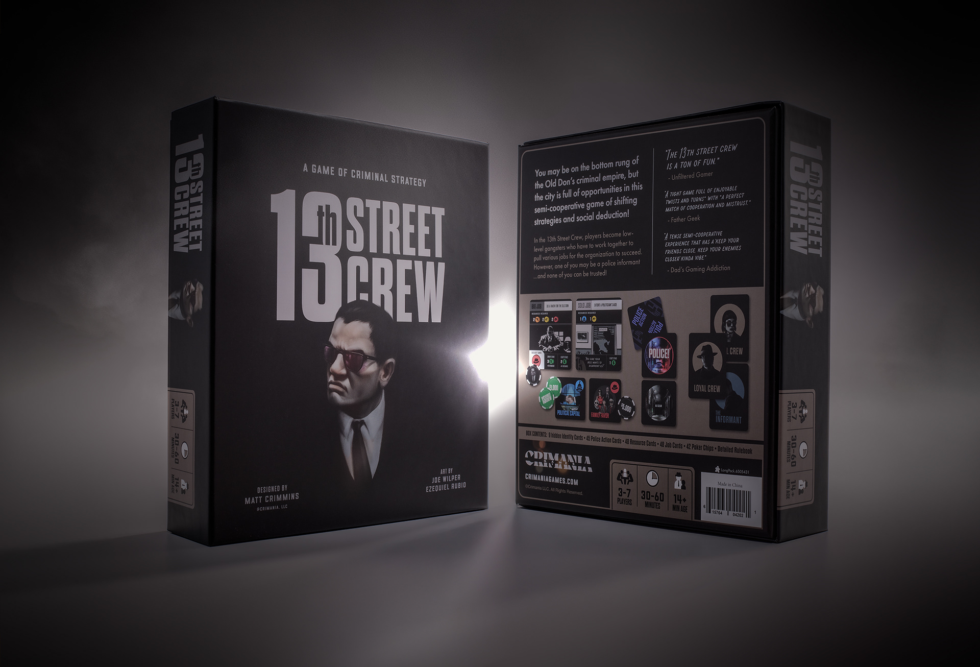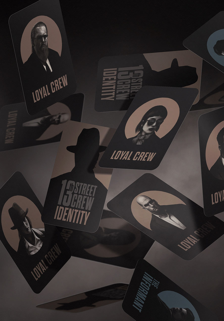 Working closely with Crimania Games, the visual identity of "The 13th Street Crew" channels the gritty underbelly of organized crime, drawing from the rich tradition of noir and criminal intrigue.