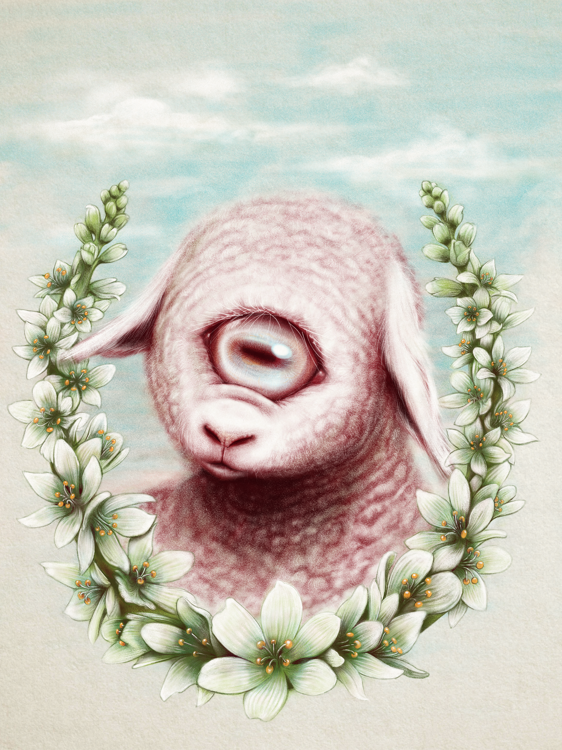 A piece done for The Sheep Show, an annual art show put on by Sullivan Higdon & Sink. The flowers are wild corn lilies, which can cause cycloptic lambs when eaten by pregnant ewes.